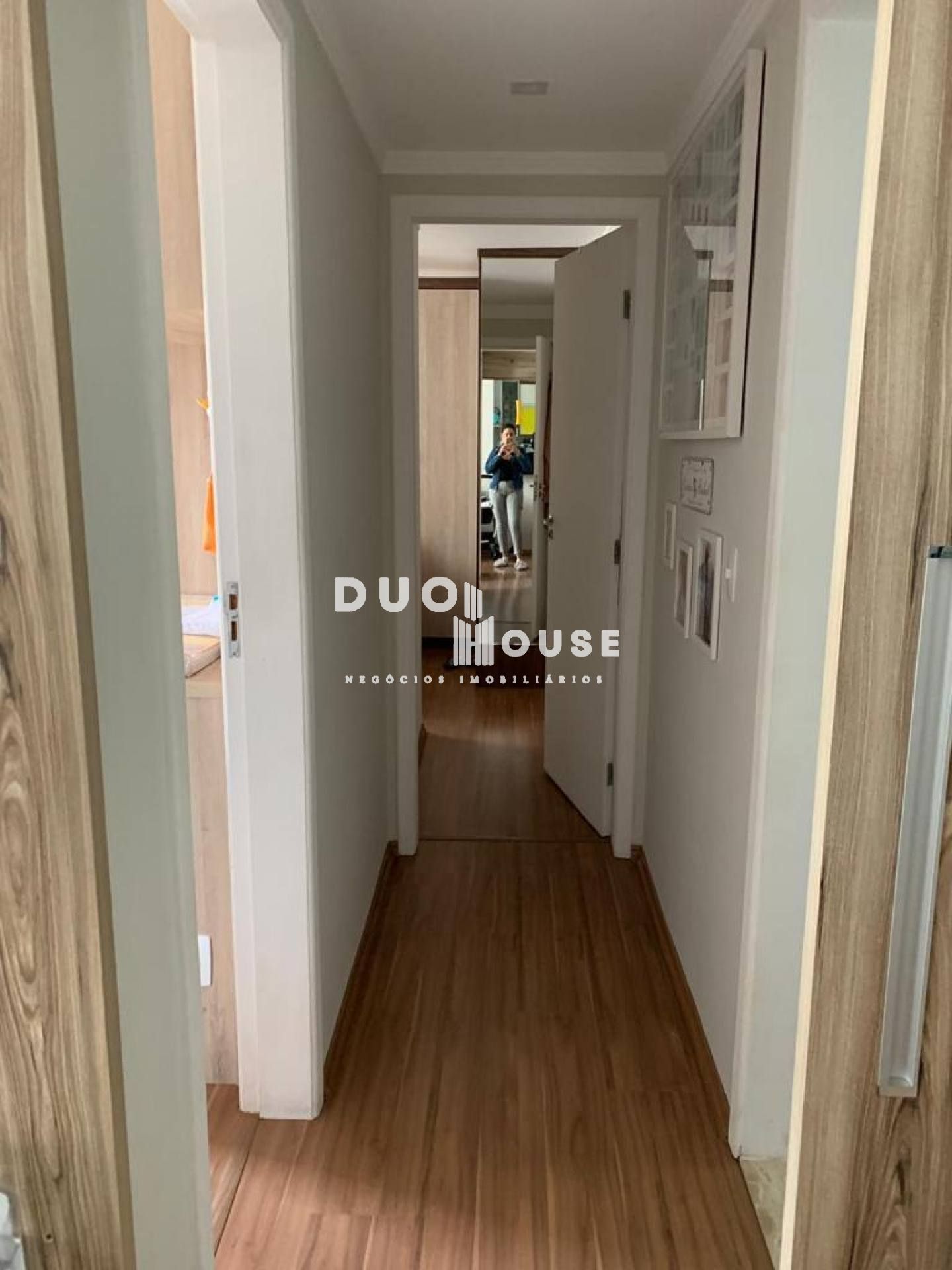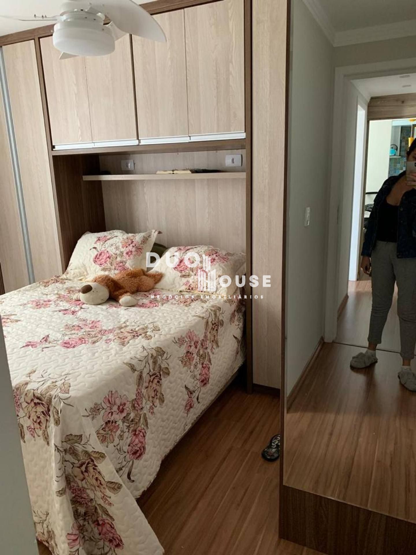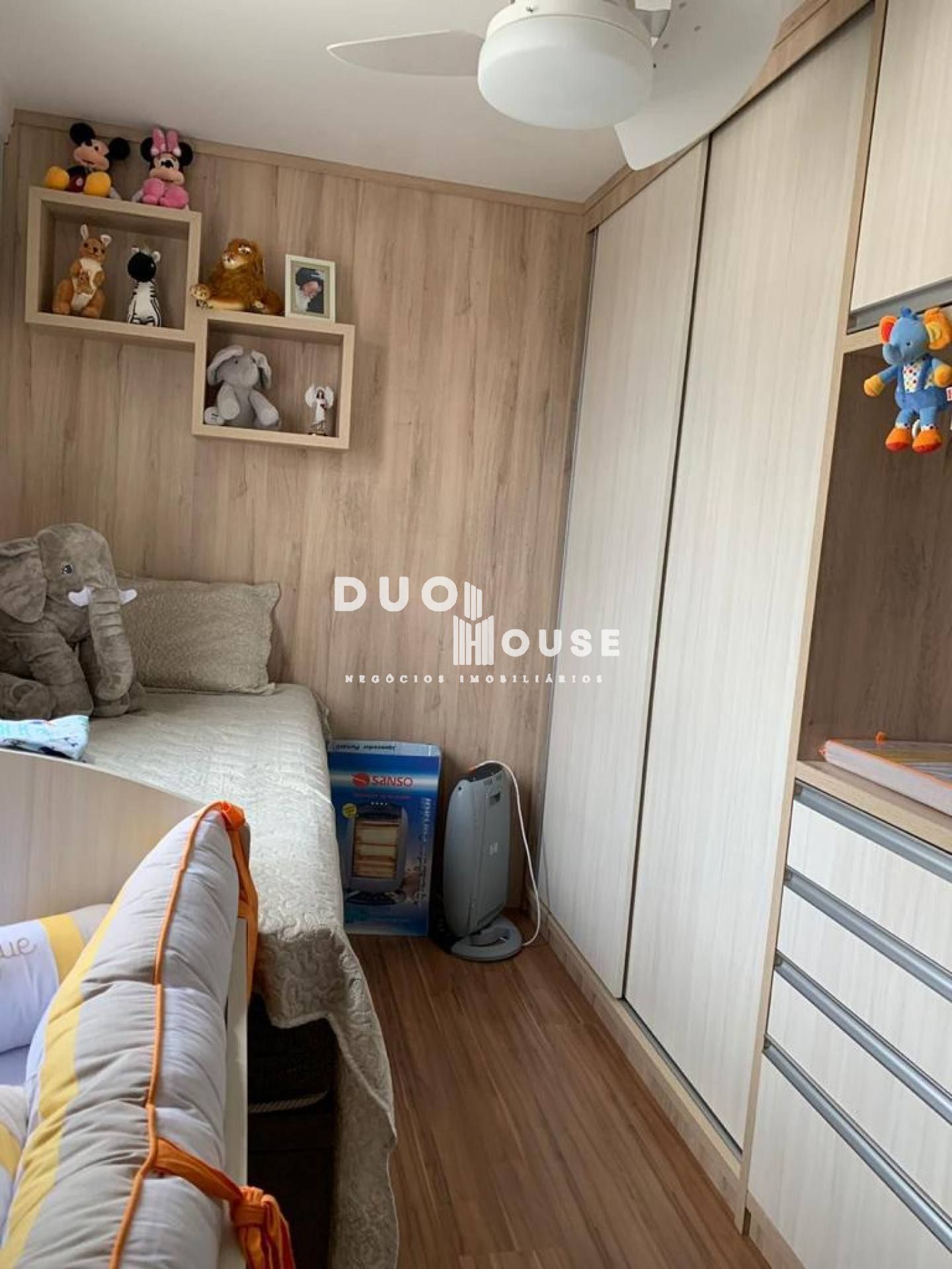 Apartamento 54m², 12º andar, 2 dormitórios sendo uma suíte, parede de espelho na sala de jantar e painel de madeira na sala de estar, ventiladores de teto nos dormitórios, uma vaga de garagem coberta no térreo.