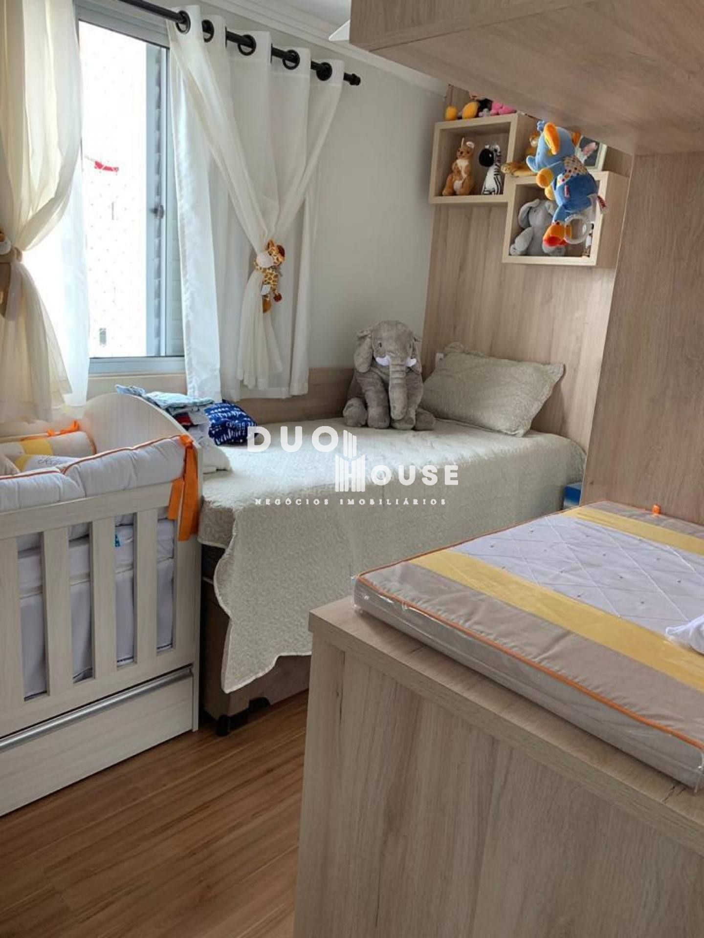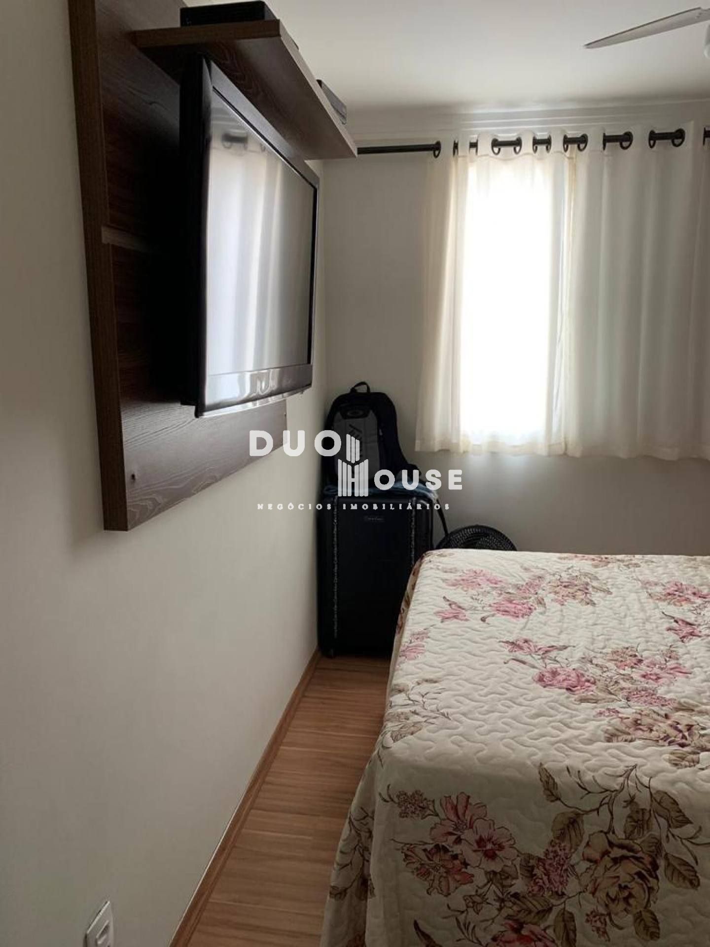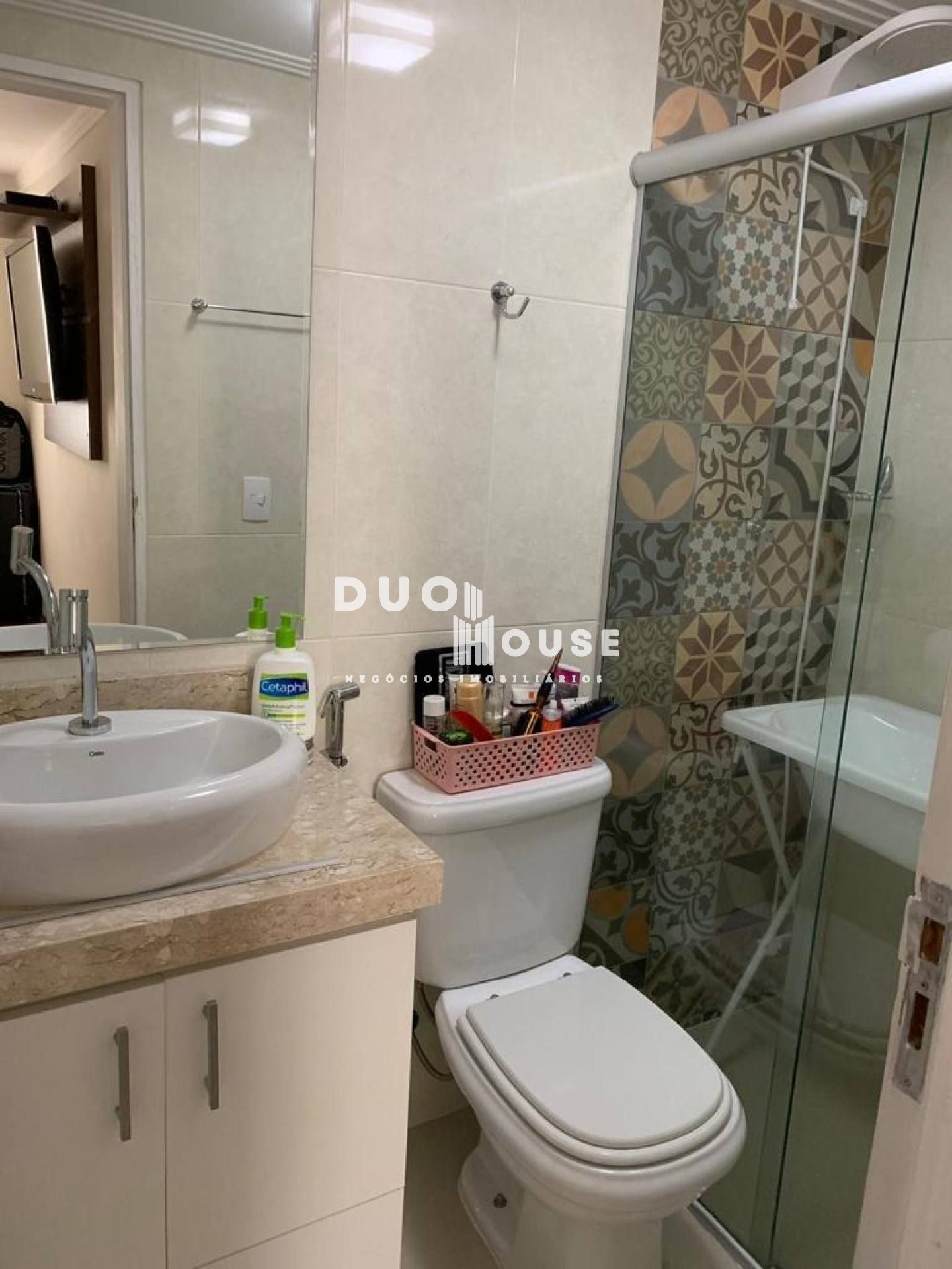 Apartamento 54m², 12º andar, 2 dormitórios sendo uma suíte, parede de espelho na sala de jantar e painel de madeira na sala de estar, ventiladores de teto nos dormitórios, uma vaga de garagem coberta no térreo.